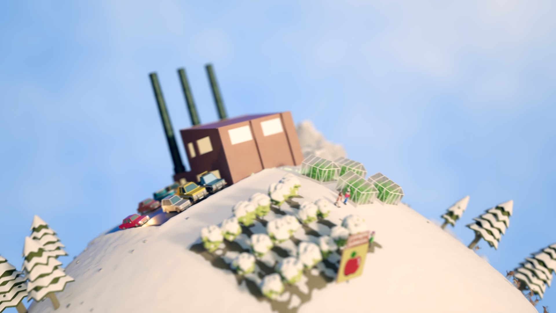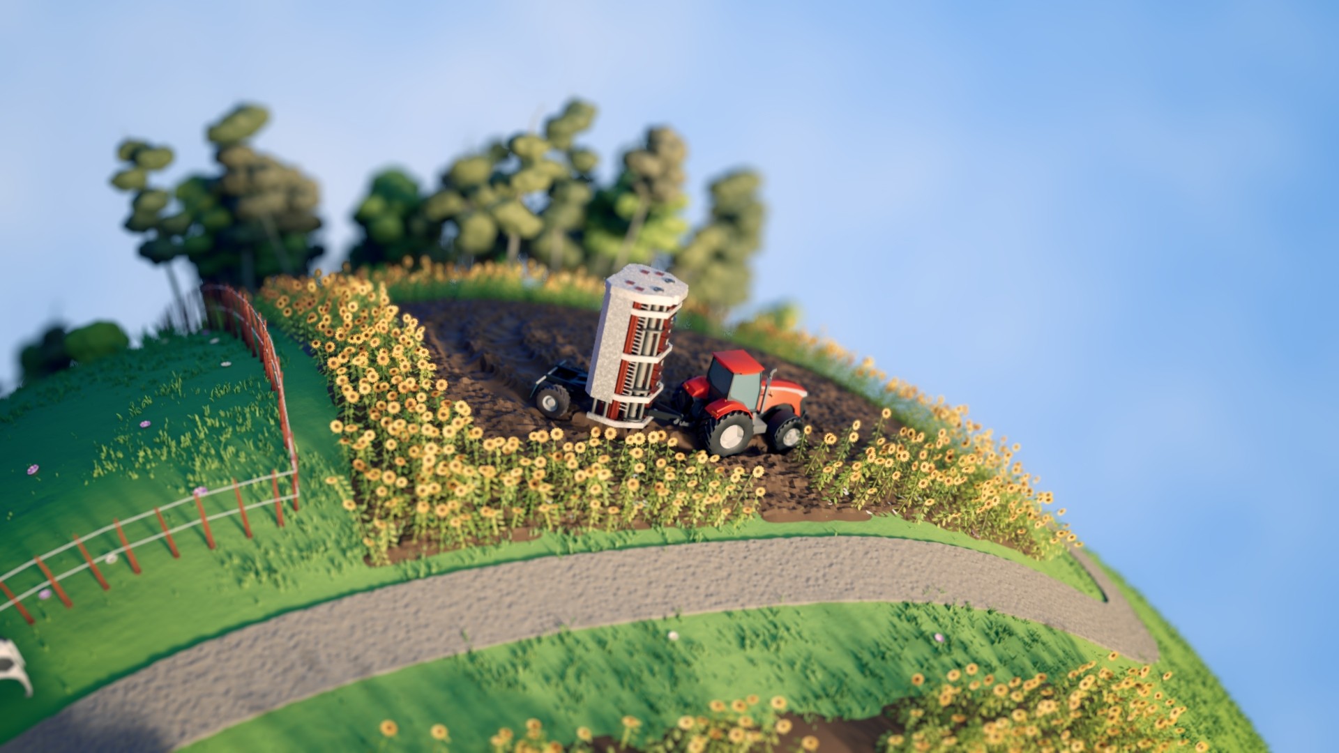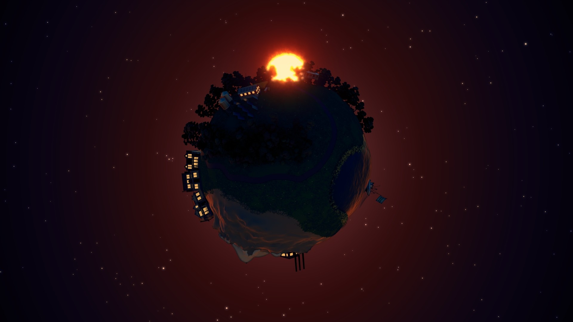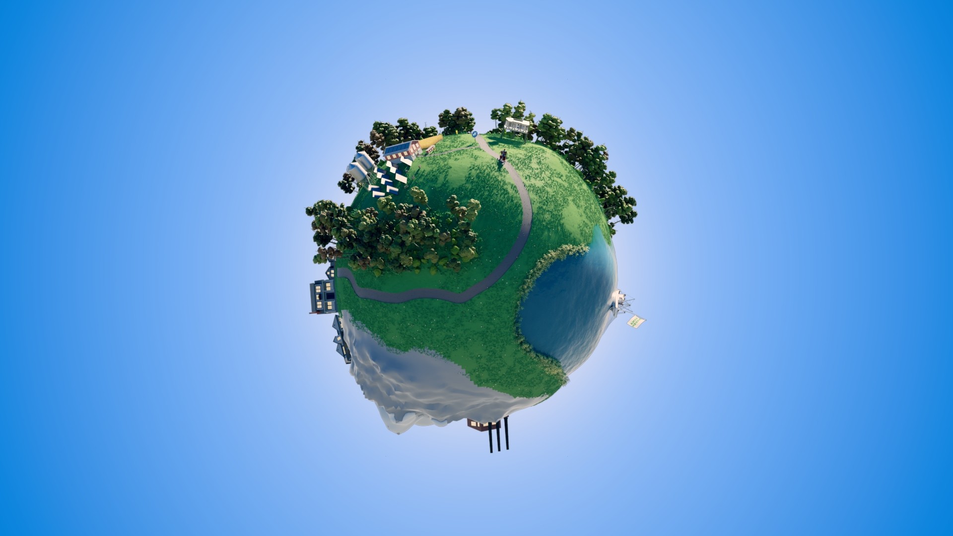 • Smooth camera moves orbit a spherical landscape, revealing new scenes and stories.